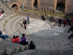 Adyacente al Foro triangular se encuentra el teatro grande, de la primera mitad del siglo II a. C., construido a la manera del mundo griego y helenístico, aprovechando la pendiente natural de una colina y restaurado y ampliado notablemente en la época romana. El espacio reservado a los espectadores estaba dividido en tres órdenes de gradas de mármol. El escenario tenía las tres puertas clásicas.
