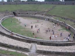 Al final de la Vía de la Abundancia (Via dell'Abbondanza), una calle transversal lleva a la plaza ante la que se levanta la mole del anfiteatro, edificado alrededor del año 80 a.C. por Gayo Quinto Valgo y Marco Porcio, duunviros quinquenales. Constituye el ejemplo más antiguo conocido hasta ahora de anfiteatro de piedra;14 en Roma, por ejemplo, el primer anfiteatro fue el de Estatilio Tauro, de 29 a.C. El anfiteatro de Pompeya, a diferencia de las construcciones similares de época imperial, no tenía galerías bajo del coso, que está mucho más bajo que el nivel de la plaza. La cávea se divide en tres series de graderías, la última de las cuales se reservaba a las mujeres. En la parte superior del anfiteatro aún son visibles los agujeros destinados a alojar las sujeciones del velario, el toldo gigante que se extendía para proteger a los espectadores del sol y la lluvia. El anfiteatro fue escenario de un concierto del grupo derock Pink Floyd en 1971.